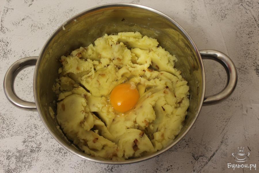 2. Лук нарежьте кубиками и обжарьте на растительном масле до золотистого цвета. Добавьте в картофельное пюре и перемешайте. Вбейте 1 куриное яйцо, немного подсолите и снова перемешайте. Закройте кастрюлю крышкой и дайте пюре немного поостыть.