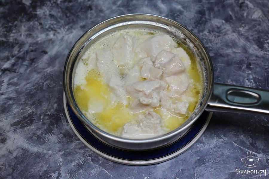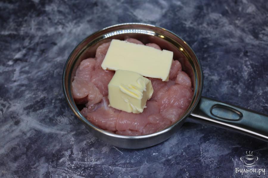 4. Перемешивайте кусочки индейки с маслом, пока оно полностью не растопится. Затем накройте ковш крышкой и готовьте мясо таким образом 1,5 часа.