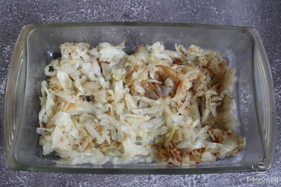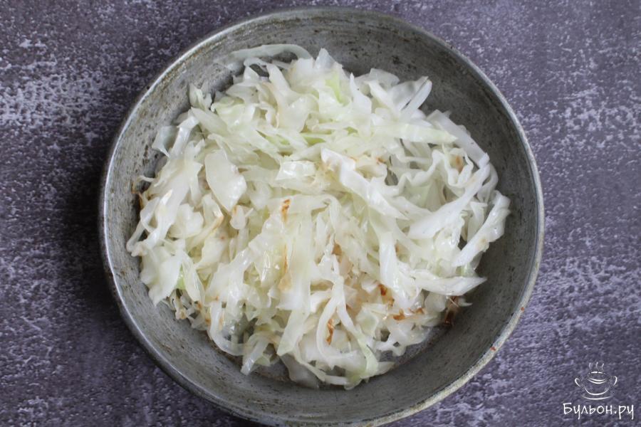 1. Капусту тонко нашинковать, немного посолить и помять руками. На сковороду добавить 2 ст. л. масла. выложить капусту, жарить 5 минут, помешивать..