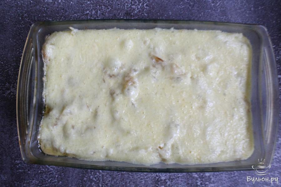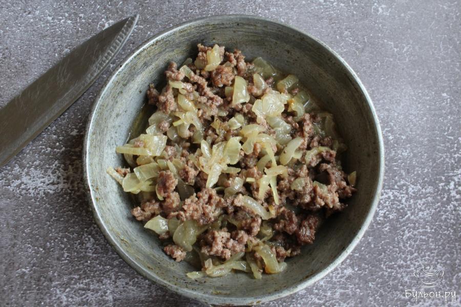 4. Лук мелко нарезать, обжарить несколько минут на сковороде с оставшимся маслом. Добавить фарш и обжарить все вместе 15 минут. Посолить по вкусу.