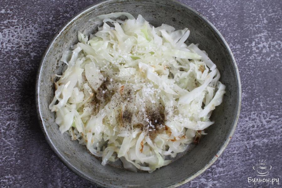 2. Капусту поперчить, если надо подсолить. Затем убавить огонь, накрыть сковороду крышкой и тушить капусту 10 минут.