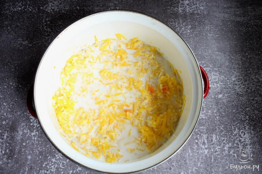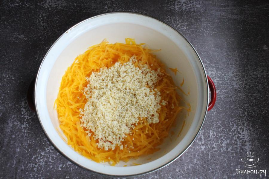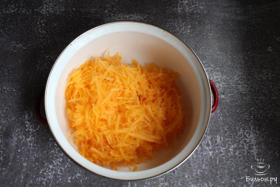 1. Тыкву почистить, промыть, перетереть через крупную терку. Выложить тыкву в кастрюлю, добавить воду и варить тыкву 5-6 минут.
