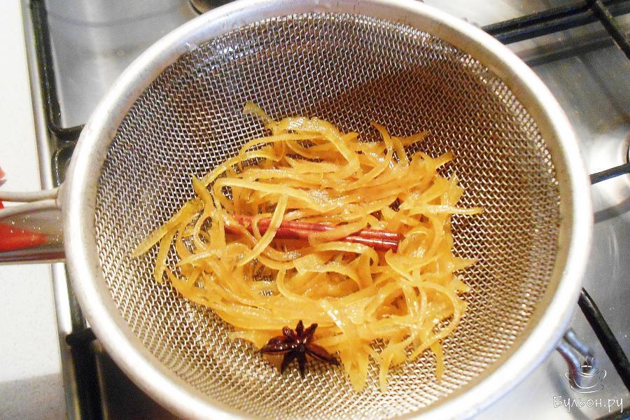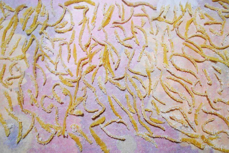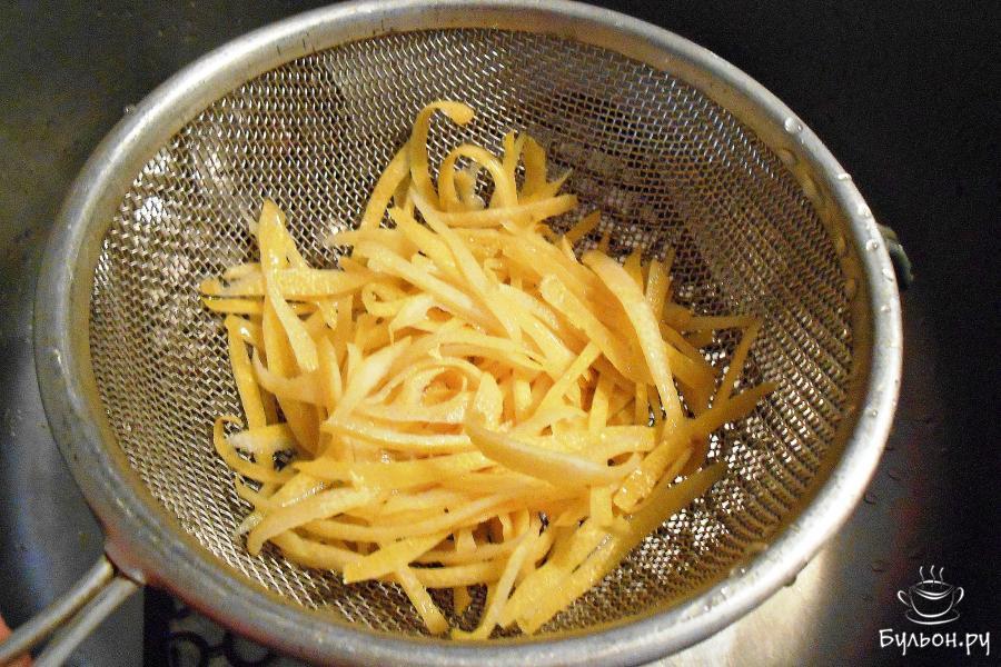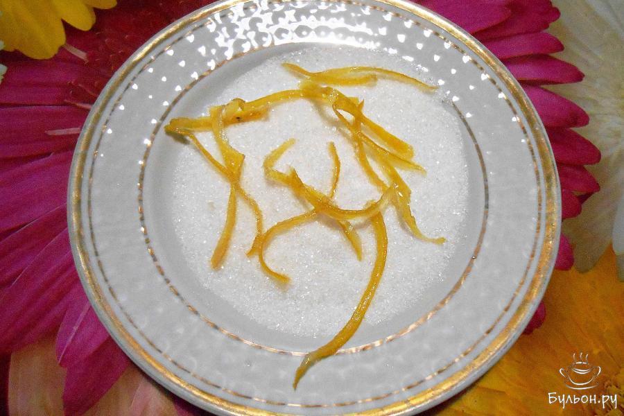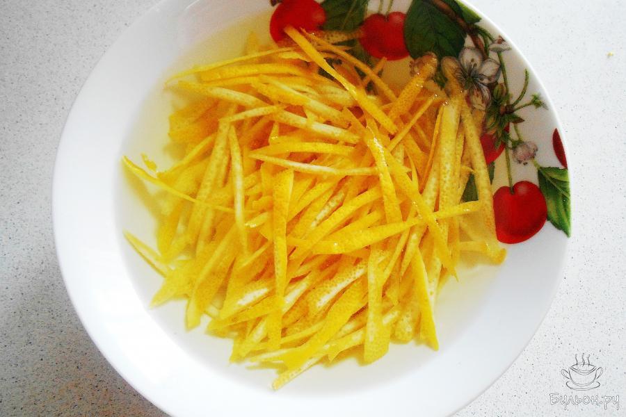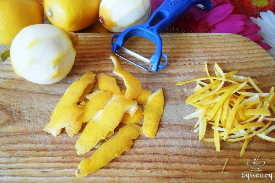 1. Лимоны тщательно помыть, просушить бумажным полотенцем, снять желтую часть кожуры без белой внутренней части с помощью ножа для чистки овощей и нарезать корки полосочками.