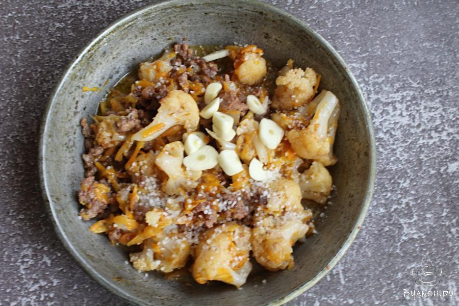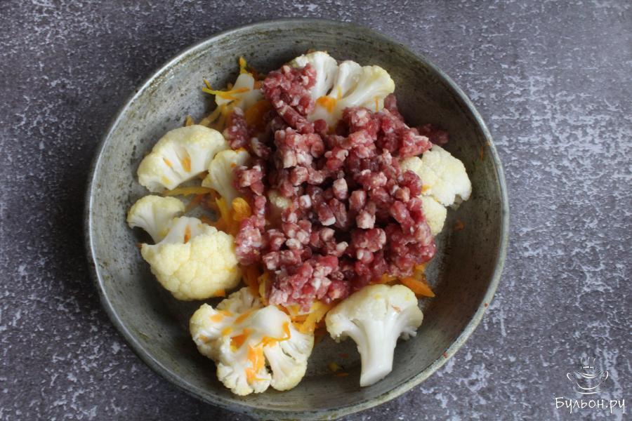 1. Цветную капусту разобрать на соцветия, промыть. Морковь почистить, промыть и натереть через крупную терку. На сковороду налить масло и выложить овощи. Жарить овощи 5 минут.