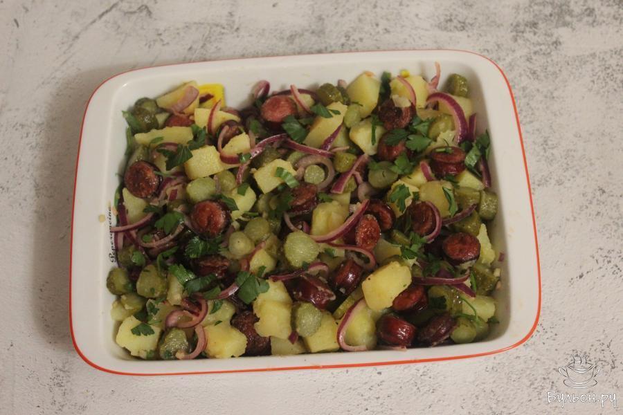 6. В миску с луком выложите все подготовленные ингредиенты и быстрыми движениями перемешайте салат. Готовый салат подайте сразу же на стол, пока он еще теплый.