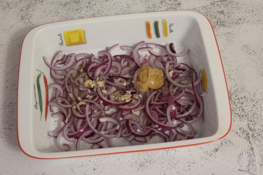 2. Красную луковицу тонко нашинкуйте полукольцами, переложите в миску. Добавьте измельченный чеснок, горчицу, лимонный сок, перец и соль. Перемешайте и отставьте лук в сторону для маринования.