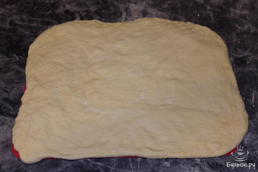 5. Затем тесто обомните и оставьте еще на 40-50 минут в тепле. Далее, рабочую поверхность присыпьте мукой, выложите на нее тесто, разомните его руками, превратив в прямоугольник.