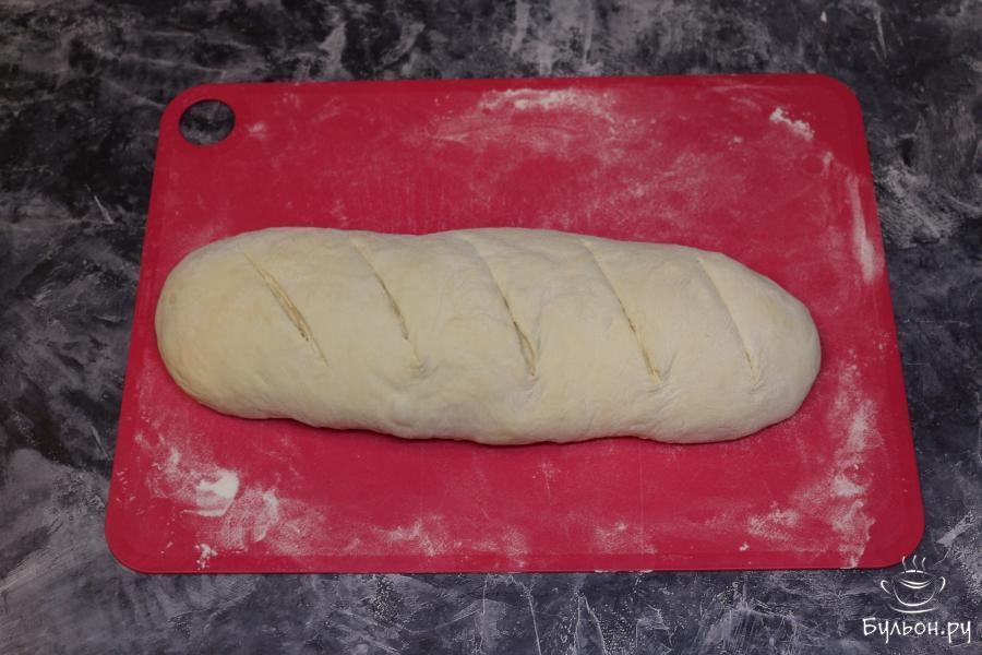 6. Заверните тесто в рулет, защепните край. Для красоты сделайте насечки острым ножом на поверхности батона. Хлеб переложите в рукав для запекания, закройте его с обеих сторон. Положите на противень и оставьте на расстойку еще на 15 минут.