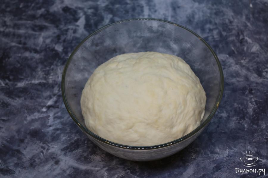 4. Замесите тесто, затем выложите его, на смазанную маслом, рабочую поверхность и вымешивайте его 5 минут, чтобы получилось однородное, мягкое тесто. Уже подготовленное тесто выложите в чистую емкость, также смазанную маслом. Накройте ее и оставьте в теплом месте на 1,5 часа.