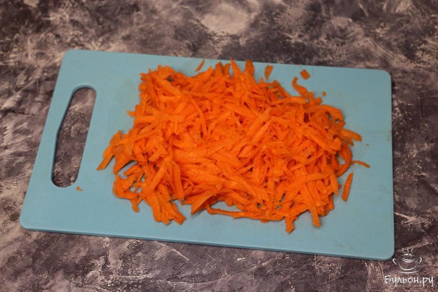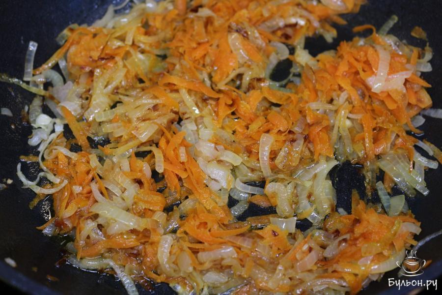 5. Затем к луку добавьте тертую морковь, перемешайте, сковороду закройте крышкой, убавьте огонь и готовьте еще 5 минут.