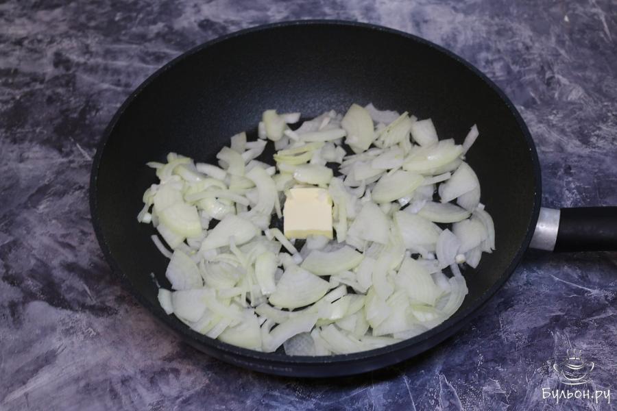 4. В сковороду влейте растительное масло, положите 20 грамм сливочного масла, добавьте нарезанный лук. Жарьте на среднем огне в течение 5 минут.