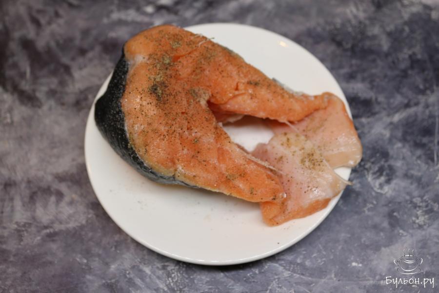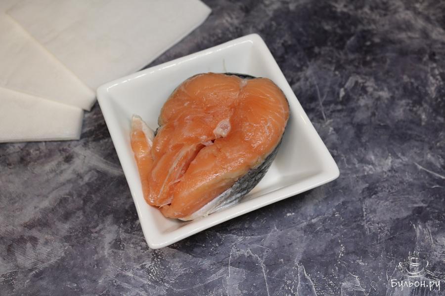 1. Из холодильника достаньте охлажденный стейк лосося, промойте его, после чего промокните бумажными салфетками.