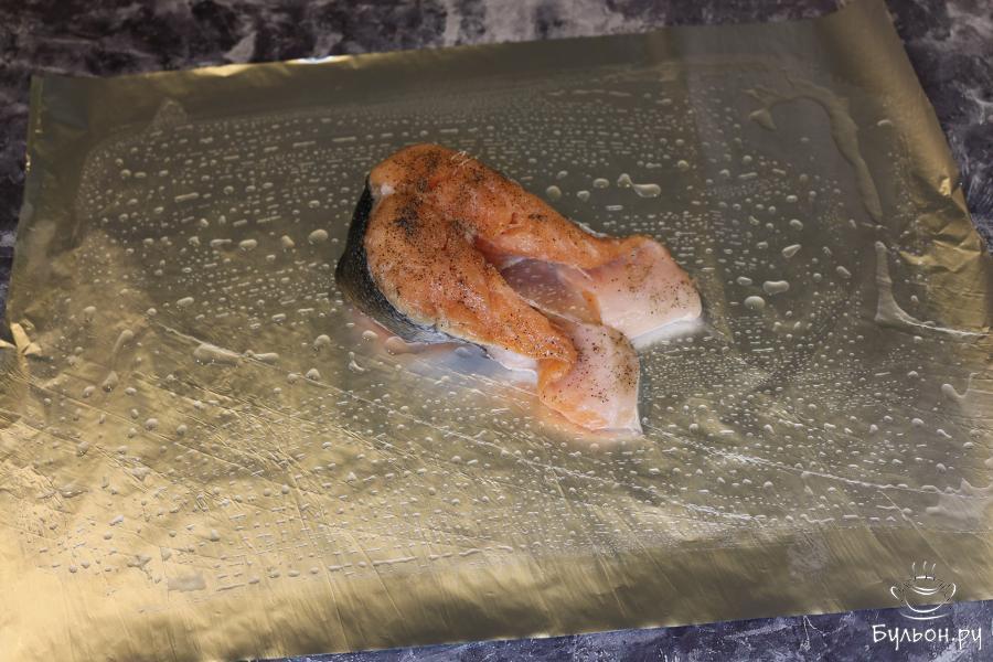3. Отрежьте два куска фольги, положите один на другой кусок, верхний смажьте маслом, так рыба не прилипнет к фольге. Стейк выложите на фольгу.