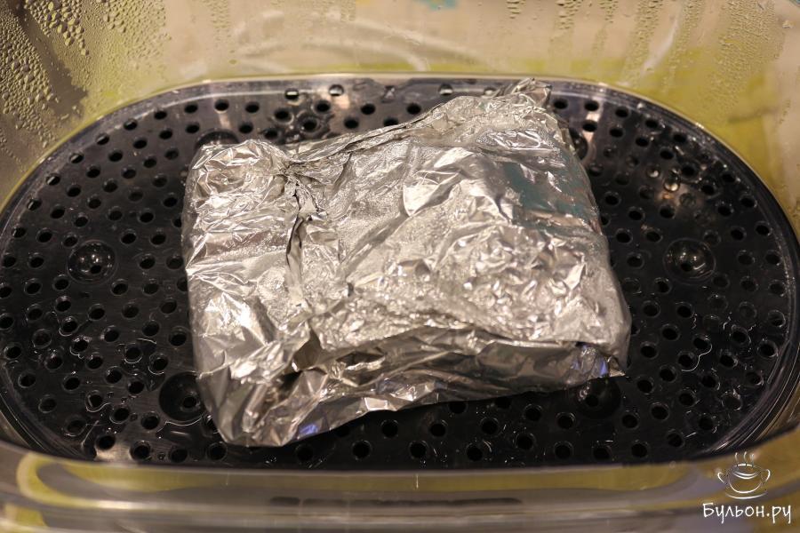 4. Рыбу заверните полностью в фольгу. Положите ее в чашу пароварки, пароварку накройте крышкой и установите режим готовки на 20 минут.