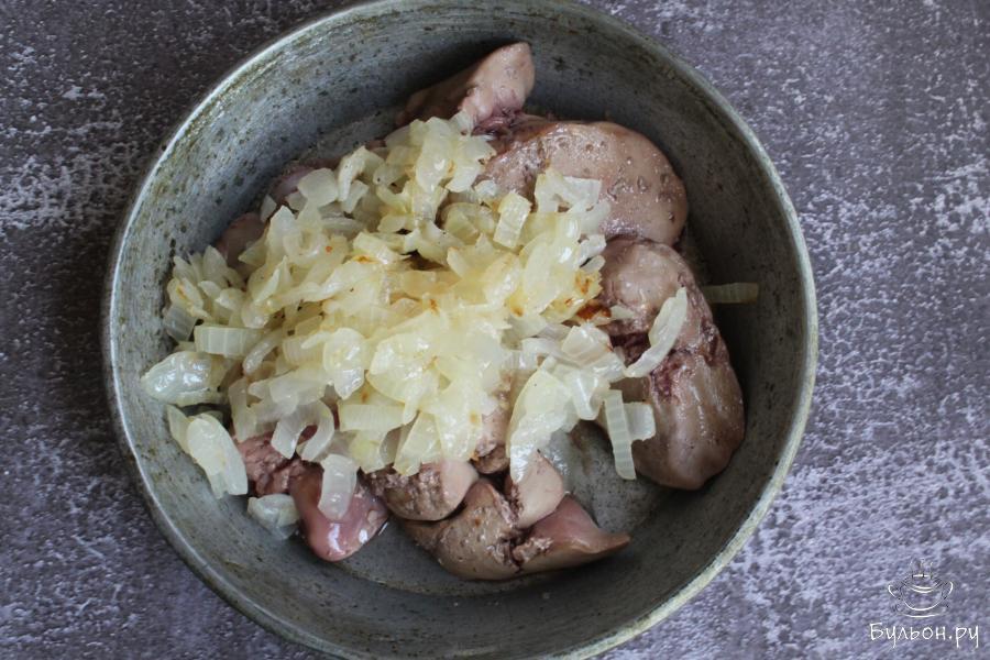 2. Лук почистить, промыть, нарезать мелко. Обжарить лук до мягкости на сковороде с разогретым маслом и выложить лук в чашку.
