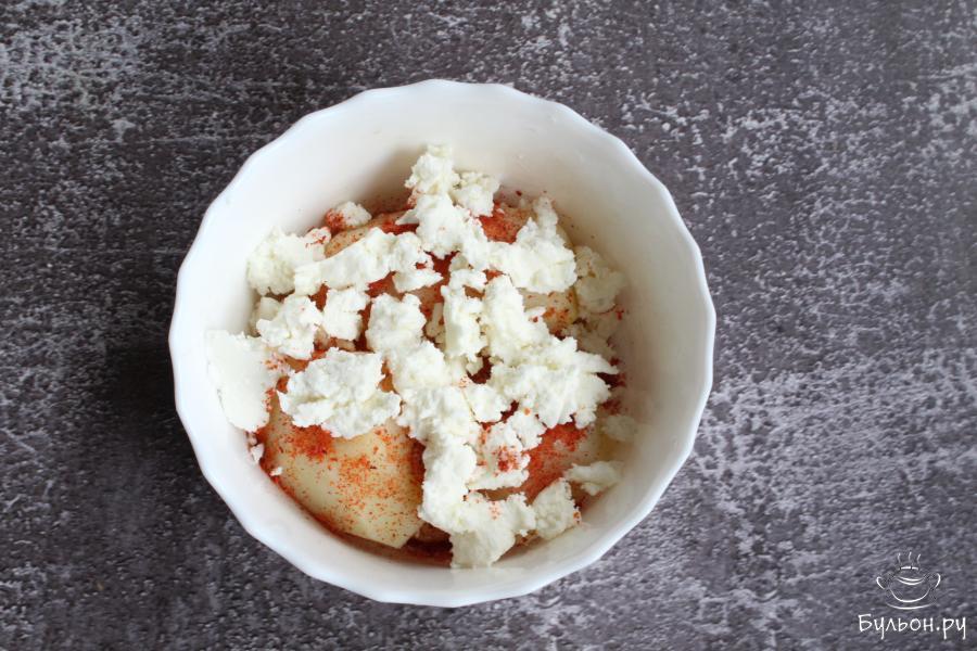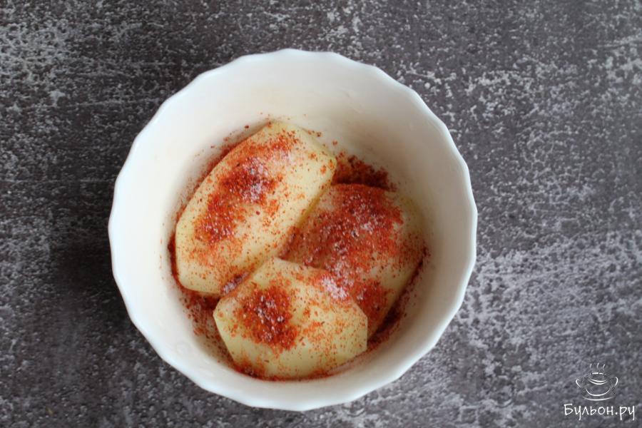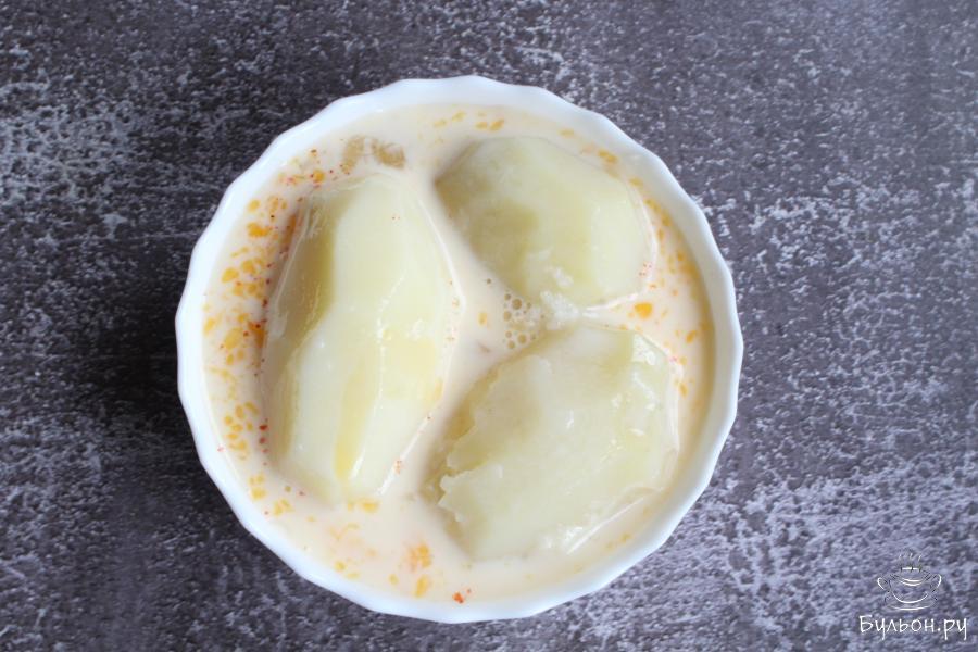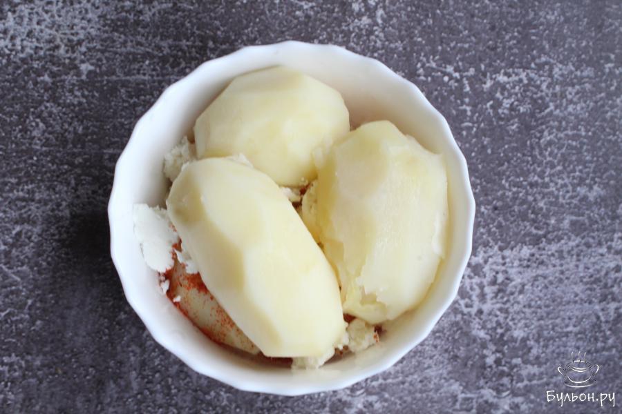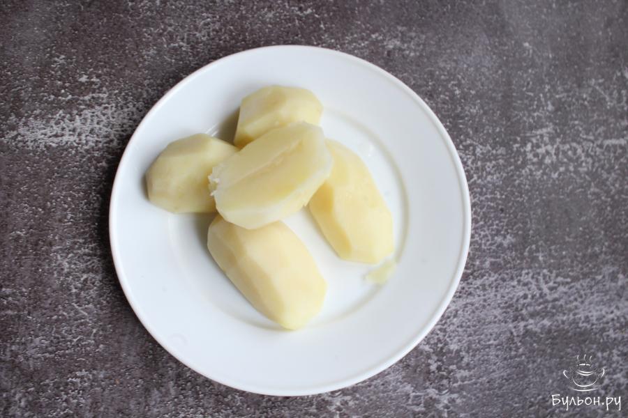 1. Картофель почистить, промыть и сварить до полуготовности целыми клубнями. Затем каждый клубень разрезать вдоль пополам.