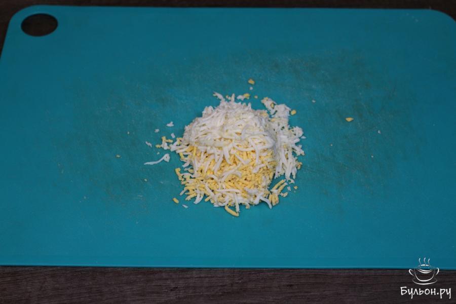 1. Яйцо предварительно отварите, после чего остудите под проточной холодной водой. Сваренное яйцо очистите от скорлупы и натрите на мелкой терке.