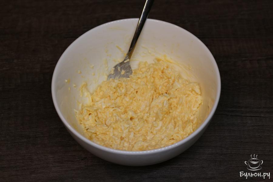 3. Выложите в миску яйца и сыр. Зубчик чеснока измельчите любым способом. Можете сделать это через пресс, ножом или на терке. Добавьте чеснок и майонез в миску, посолите по необходимости. Много соли не добавляйте, в сыре и майонезе она уже есть. Перемешайте все ингредиенты до однородной массы.