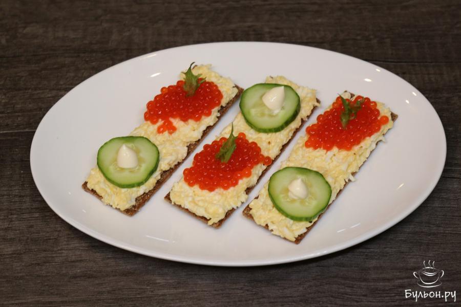 Закуска с сырной намазкой и красной икрой станет отличным украшением праздничного стола. Такая закуска получается: взрывной на вкус, поскольку она состоит из ржаного хрустящего хлебца, нежной - из-за яйца и одновременно острой - из-за сыра, чеснока и майонеза намазки, сочного огурчика и соленой красной икры. Но все ингредиенты вместе отлично сочетаются, поэтому закуска получается вкусной и быстро исчезнет с праздничного стола.