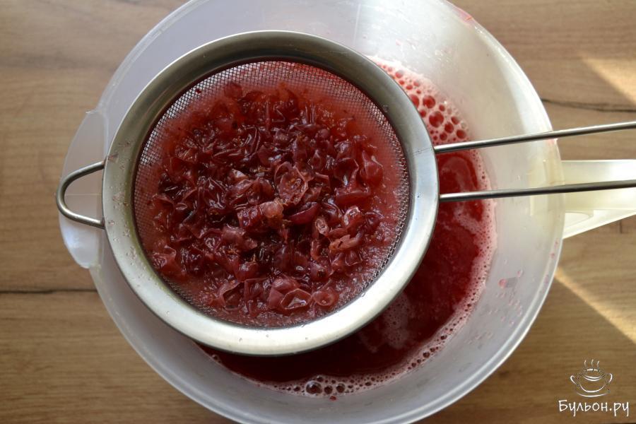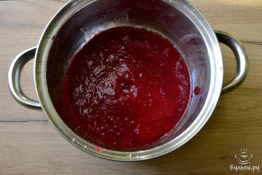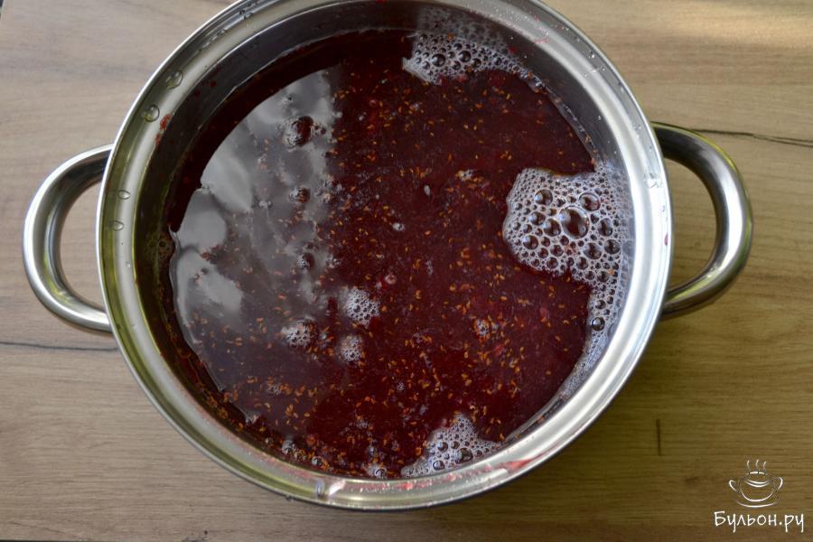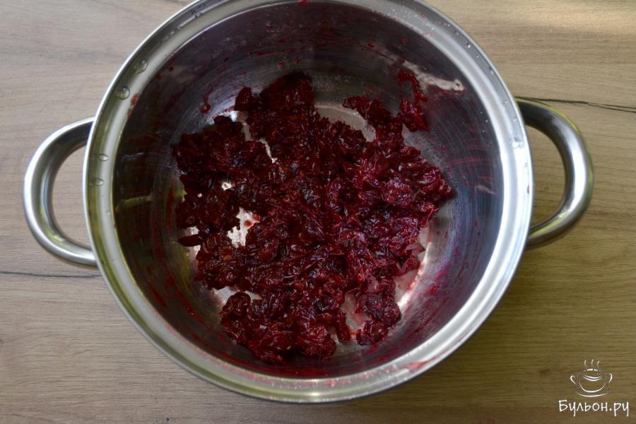 6. Залейте клюквенный жмых водой и поставьте кастрюлю на огонь. Доведите отвар до кипения, сделайте огонь тихим и проварите жмых 5-6 минут. Снимите с огня и остудите до комнатной температуры.