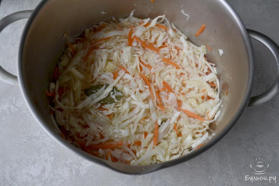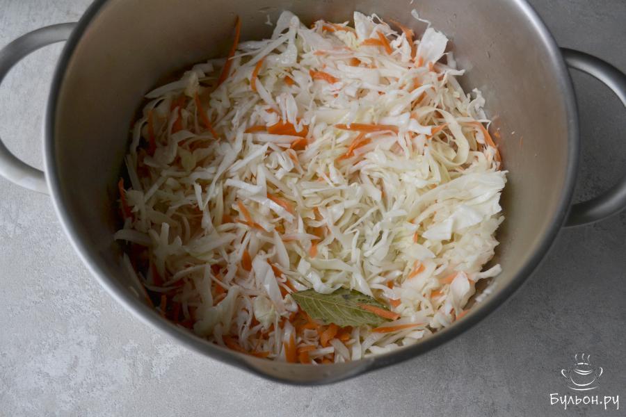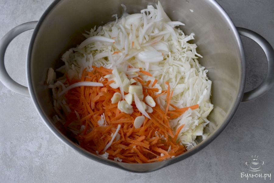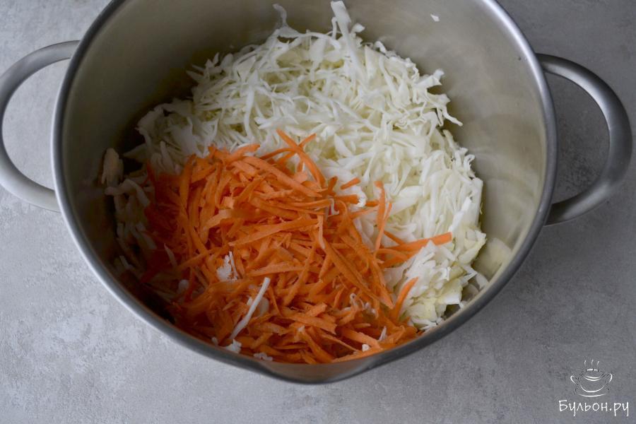 1. Белокочанную капусту очистите от верхних листьев и нарежьте тонкой соломкой. Морковь очистите и натрите на крупной терке. Сложите овощи в большую кастрюлю.