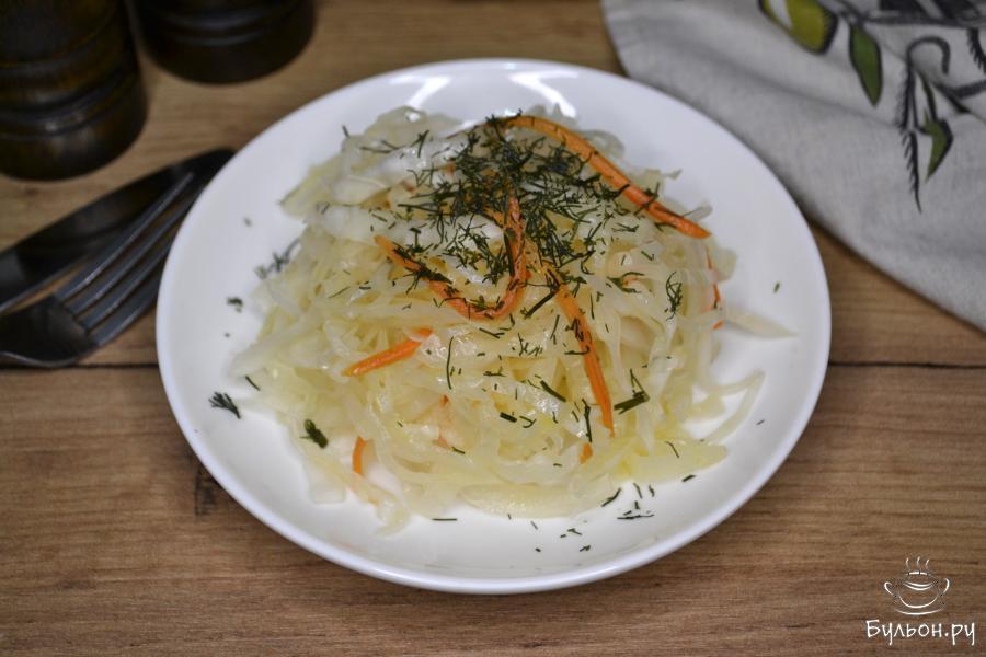 Обычно, маринованную капусту быстрого приготовления я делаю осенью-зимой, когда есть свой урожай свежей капусты. Такую капусту хорошо подать, как ароматную, хрустящую, очень вкусную закуску к любому мясному блюду, картофельному пюре или жареной картошке. Делается капуста быстро, пробовать ее можно уже через несколько часов, но лучше на следующий день. Готовую капусту нужно хранить в холодильнике. При подаче маринованную капусту можно посыпать свежей рубленной зеленью.