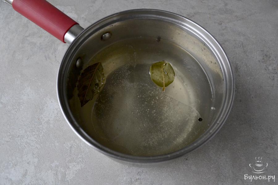 3. Для маринада налейте в кастрюлю воду, растительное масло, всыпьте сахар и соль, добавьте лавровый лист, перец горошком. Поставьте кастрюлю на огонь, доведите маринад до кипения, проварите, чтобы сахар и соль растворились. Снимите с огня и влейте уксусную эссенцию.