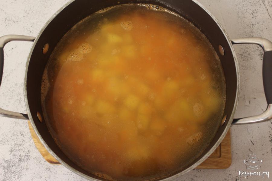3. Готовый бульон процедите в чистую кастрюлю, посолите, выложите овощи и варите 20 минут, после закипания бульона.