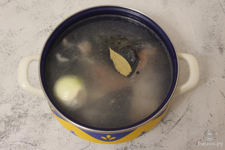 1. В кастрюлю положите голову, хвост, хребты и другие части рыбы. Залейте водой, положите луковицу, лавровый лист и перец горошком. После закипания, варите 40 минут.