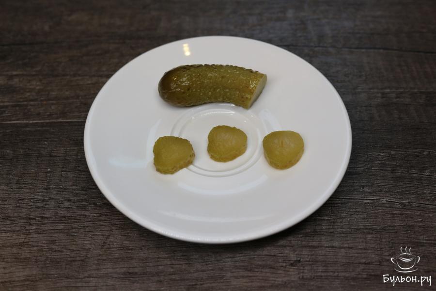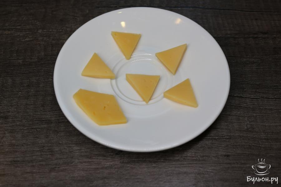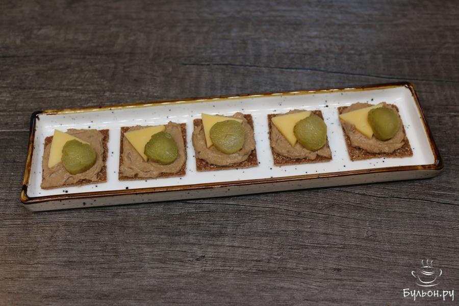 5. Теперь выложите на каждый квадратик с паштетом по кусочку сыра и огурчика. Закуска с печеночным паштетом готова.