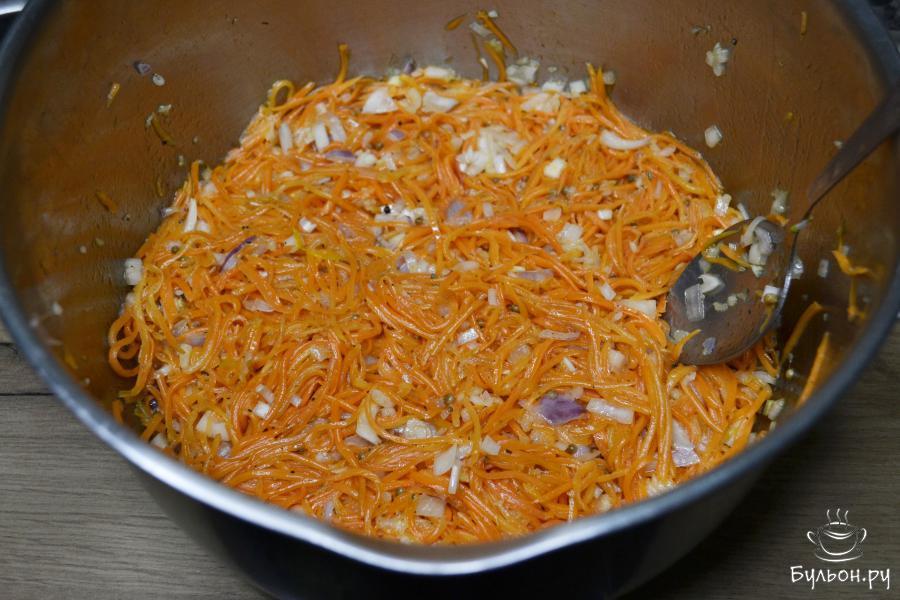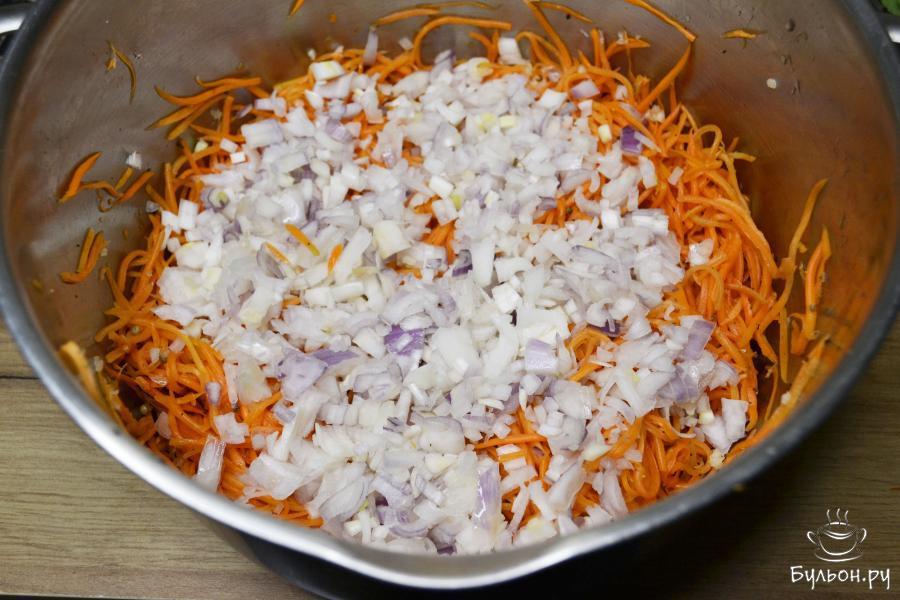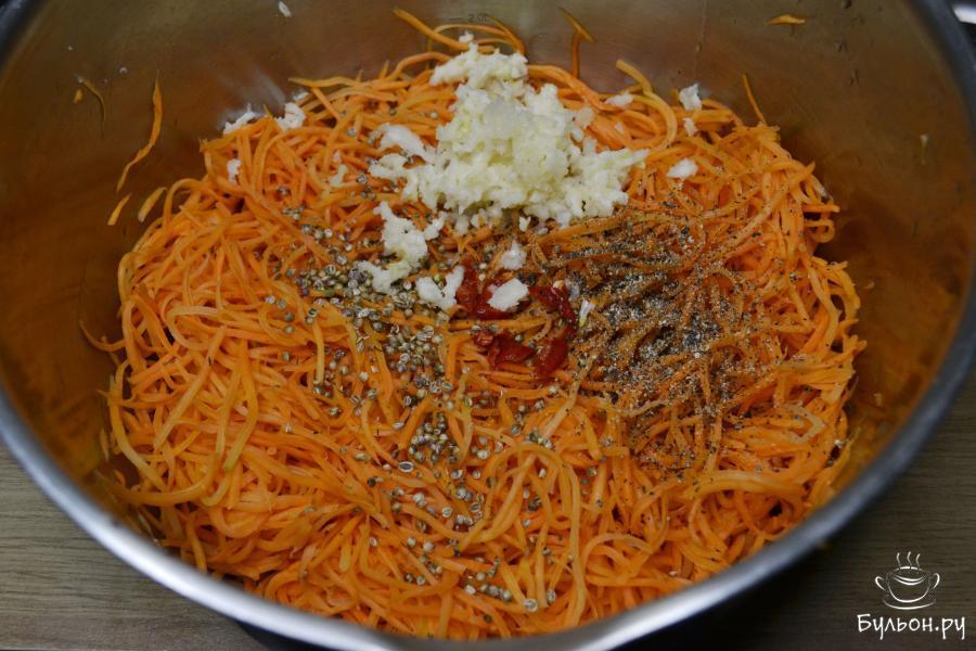 4. Добавьте к отжатой моркови пропущенный через пресс чеснок, молотый кориандр, черный и перец чили.