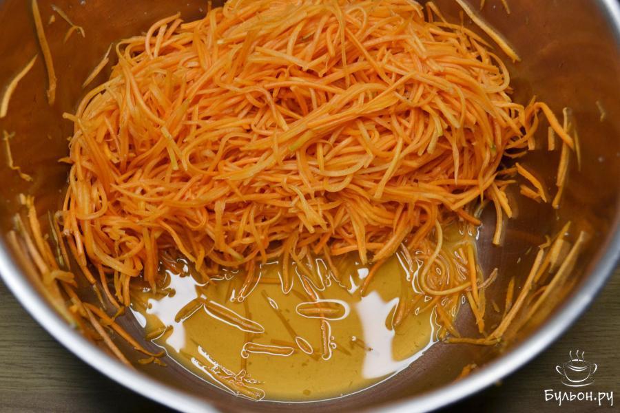 6. Раскалите растительное масло на сковороде до образования легкого дымка. Залейте это масло в кастрюлю, равномерно распределив по всему луку. Добавьте уксус. Перемешайте морковь с маслом и ложкой уплотните. Оставьте кастрюлю для пропитывания при комнатной температуре на 1 час.