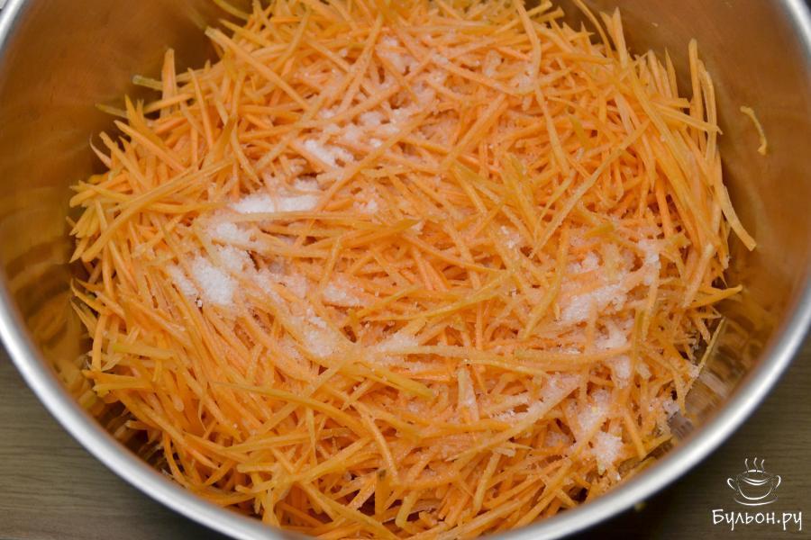 2. Переложите натертую морковь в большую посуду/кастрюлю. Посыпьте крупной солью, перемешайте и оставьте на кухонном столе на 15-20 минут.