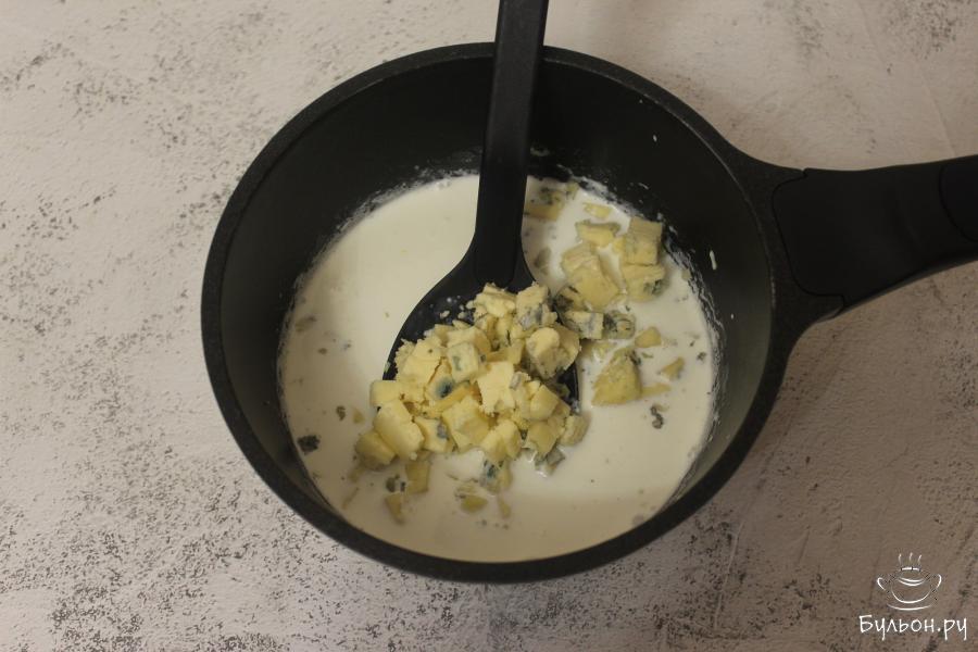 4. При появлении на поверхности сливок первых бульков, добавьте в ковшик кубики сыра. Перемешивая готовьте соус до полного растворения сыра. При необходимости досолите соус.