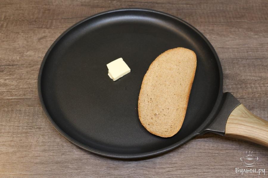 1. На сковороду выложите кусочек сливочного масла, растопите его и выложите кусочек деревенского серого хлеба. Жарьте хлеб с одной стороны на среднем огне.