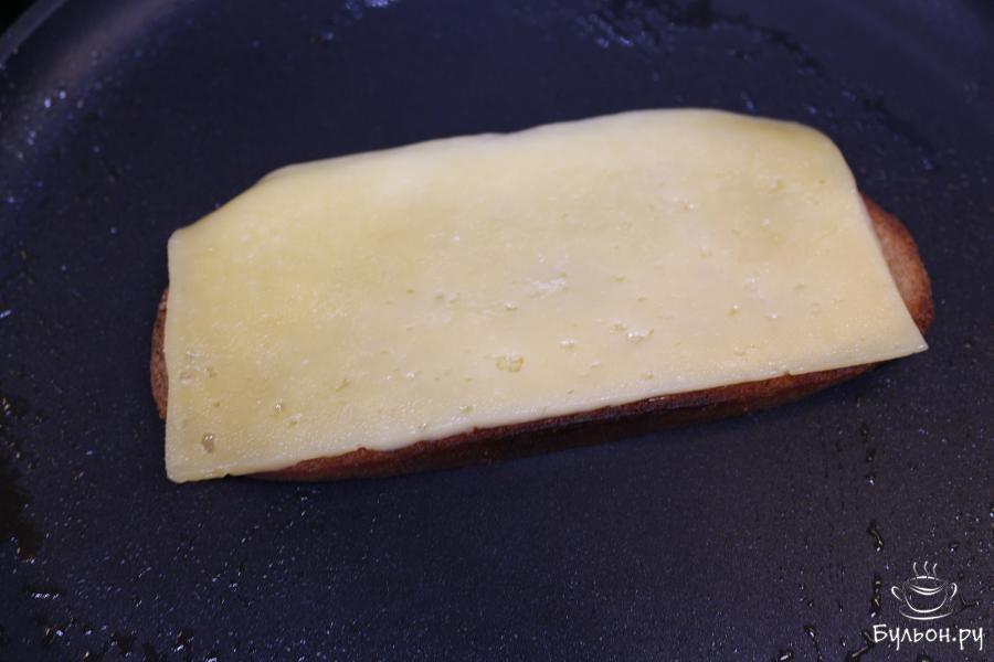 2. Натрите обжаренную сторону хлеба чесноком. Затем выложите хлеб жарить на другую сторону, уменьшите огонь. Тут же положите на хлеб ломтик сыра, чтобы он расплавился. Затем хлеб с сыром положите на тарелку.