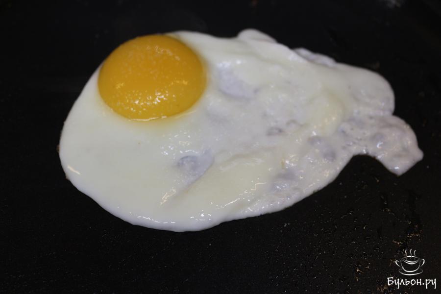 3. На этой же сковороде приготовьте яичницу-глазунью - обжарьте яйцо так, чтобы желток остался жидким, посолите.