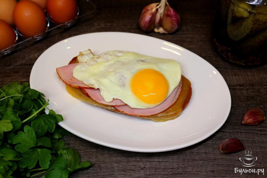 5. Сверху, выложите яичницу-глазунью. Подавайте на стол сразу, немецкий сэндвич Штраммер Макс должен быть максимально горячим.