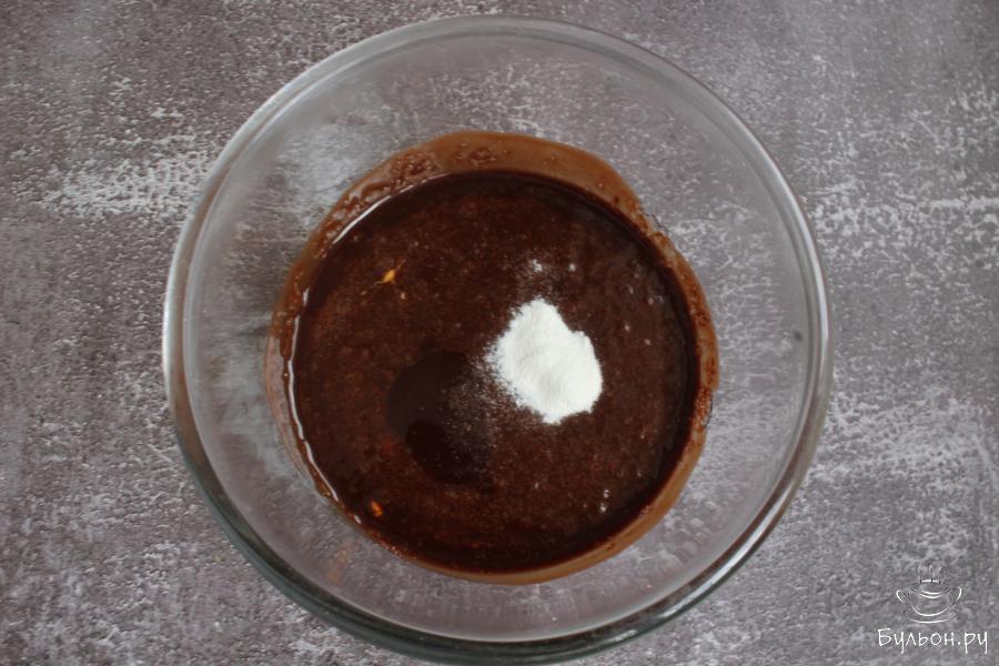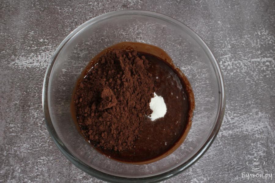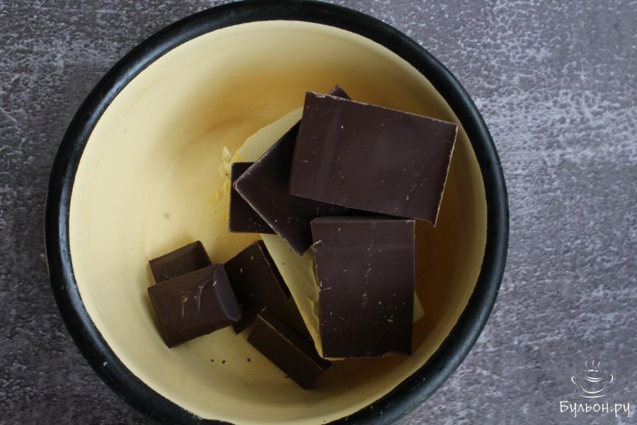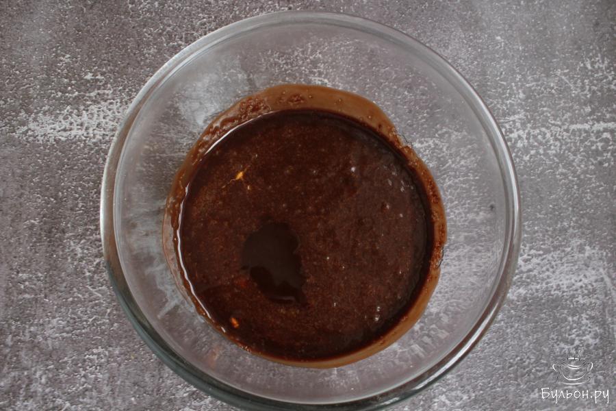 2. Сливочное масло растопить с шоколадом и остудить до теплого состояния. Шоколад можно взять сладкий. С темным шоколадом выпечка будет с легкой горчинкой.