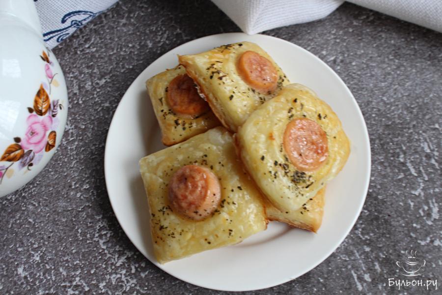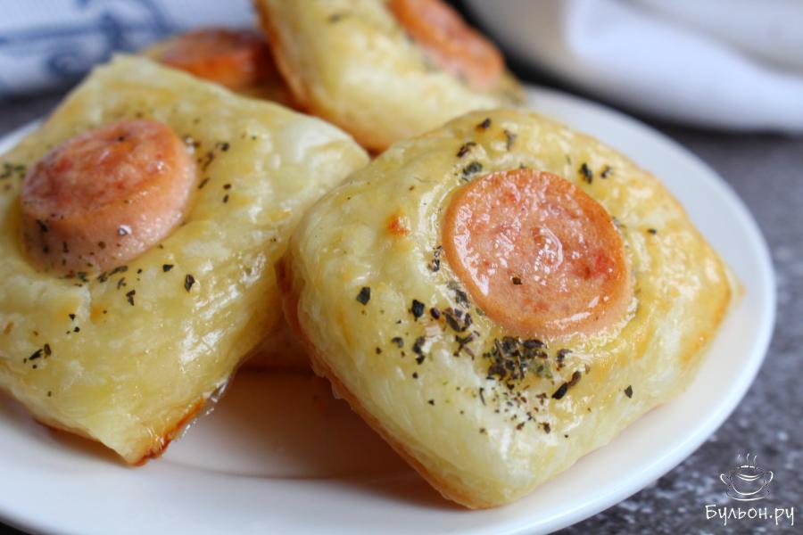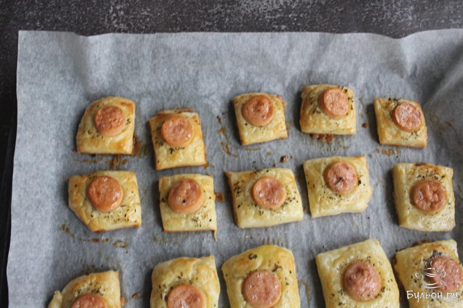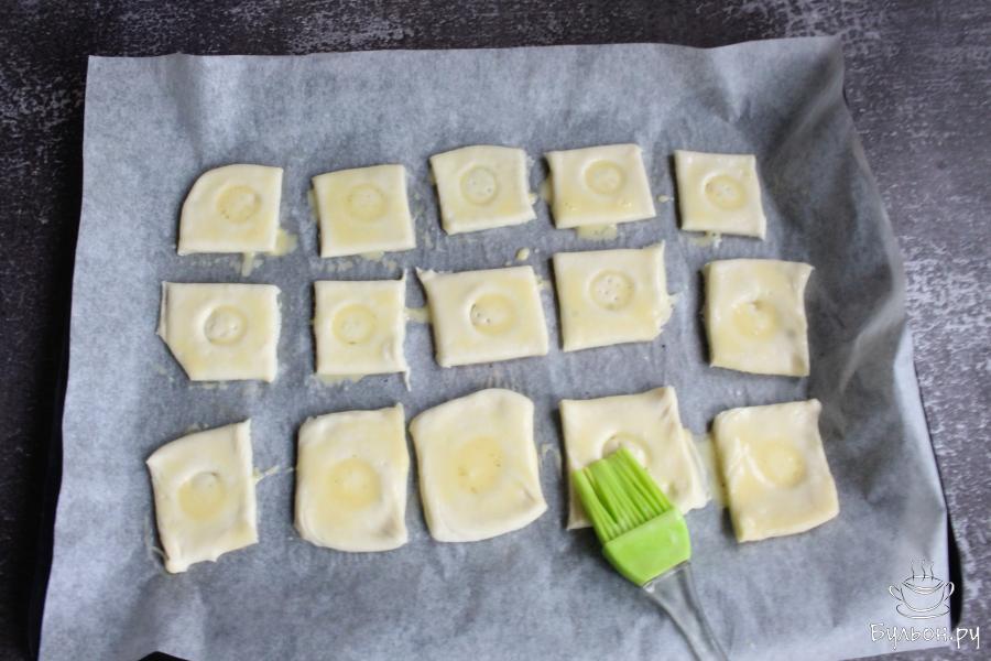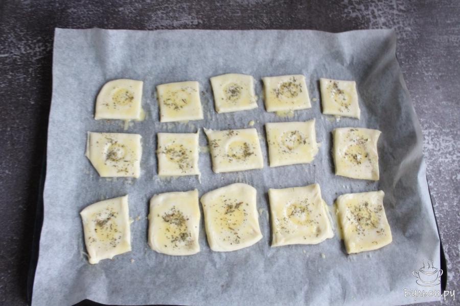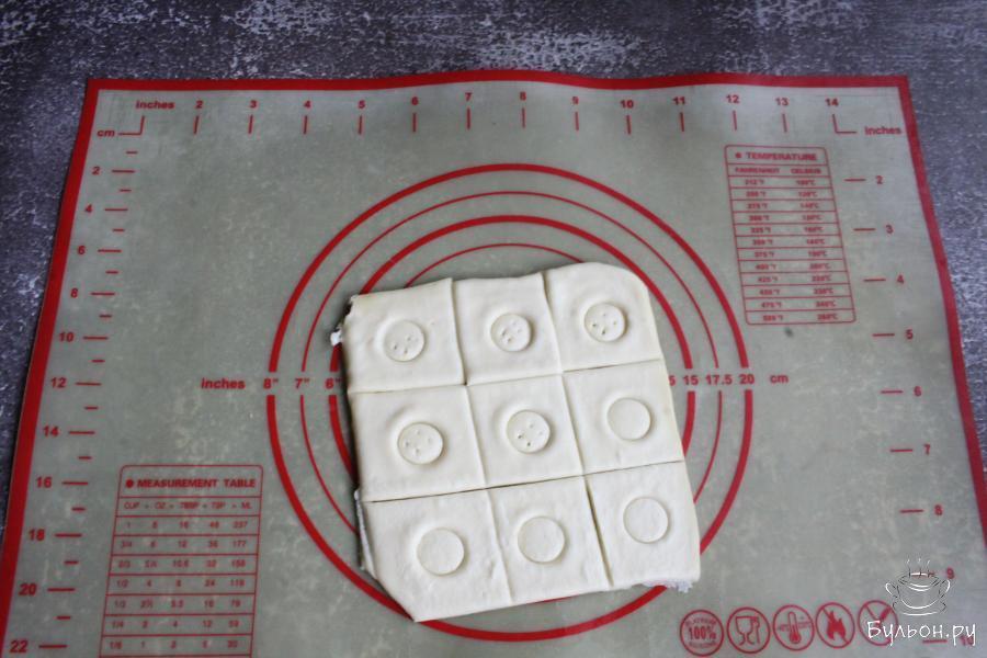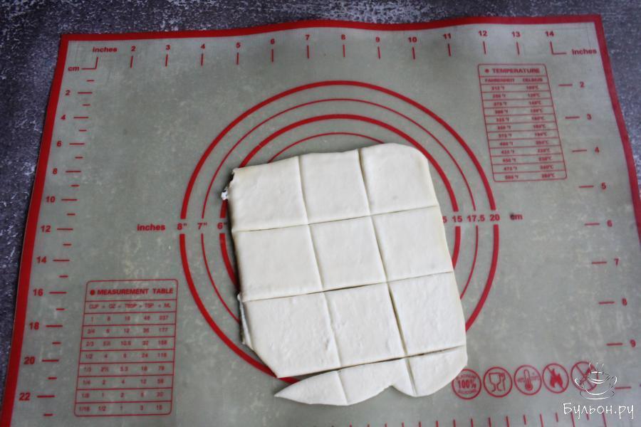 1. Слоеное дрожжевое тесто разморозить и слегка раскатать в одну сторону. Разрезать тесто на маленькие квадратики размером примерно 5х5 см.