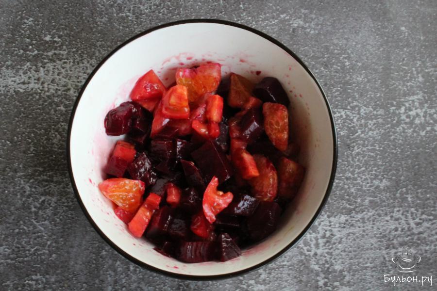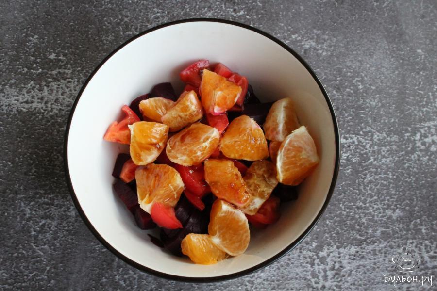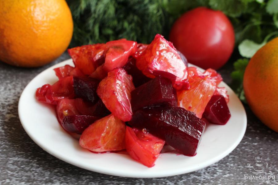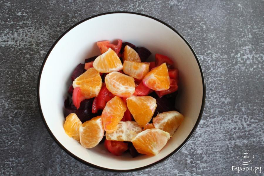 Для повседневного меню, для разгрузочных дней, для вегетарианцев и постящихся, этот салат подходит всем, главное, чтобы вы любили свеклу. Легкий свекольный салат с мандаринами и помидорами готовится просто. Салат удивит вас своим необычным сочетанием вкусов, он ароматный, невероятно сочный, очень красивый и яркий. Бодрящий вкус этого салата поднимет вам настроение и настроит на новогодний лад. Такой полезный салат можно сразу подать к столу, а можно охладить. Помидоры для приготовления берите сладкие, твердые. Если в помидорах много жидкости и семечек, лучше их убрать.