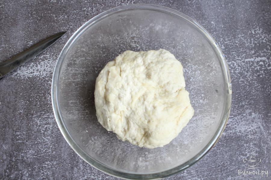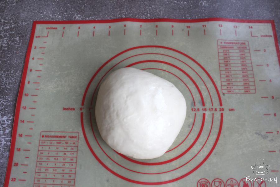 3. Добавить муку, замесить тесто. Смазать тесто маслом, накрыть пленкой и дать ему постоять минут 25-20.