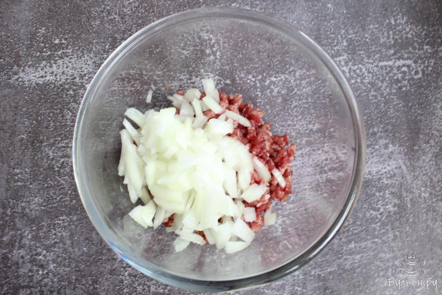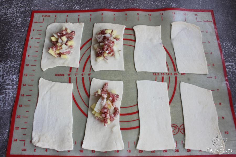 8. Тонко раскатать тесто в пласт, нарезать тесто квадратами или прямоугольниками и разложить на каждый квадрат начинку.