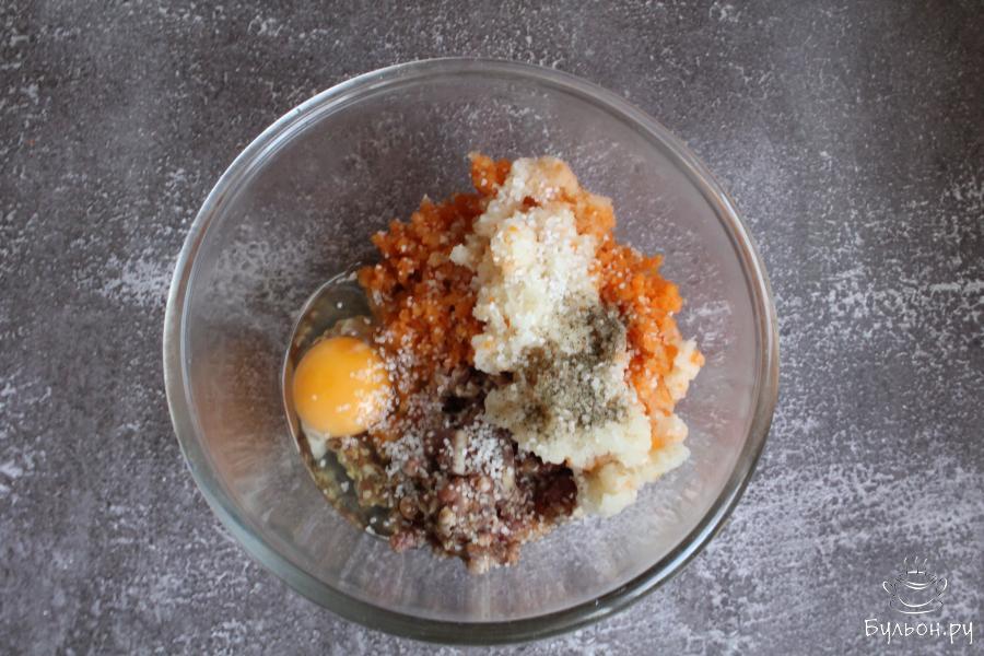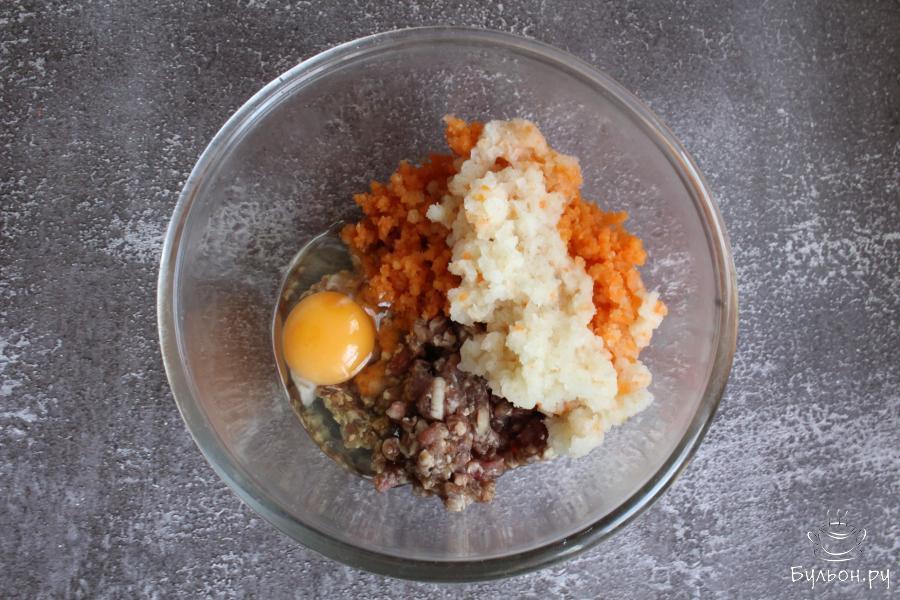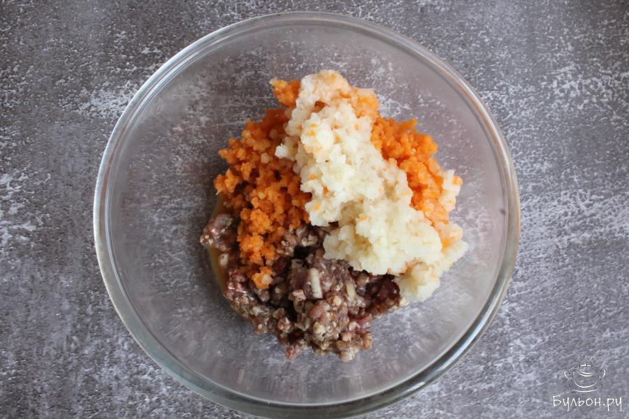 2. Фарш выложить в чашку. Морковь почистить и промыть. Перекрутить через мясорубку белокочанную капусту и морковь.