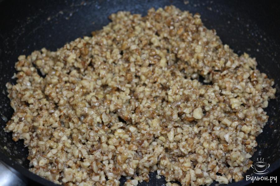5. Затем добавьте орехи и хорошо перемешайте. Периодически помешивая, прогрейте орехи с медом 10 минут.