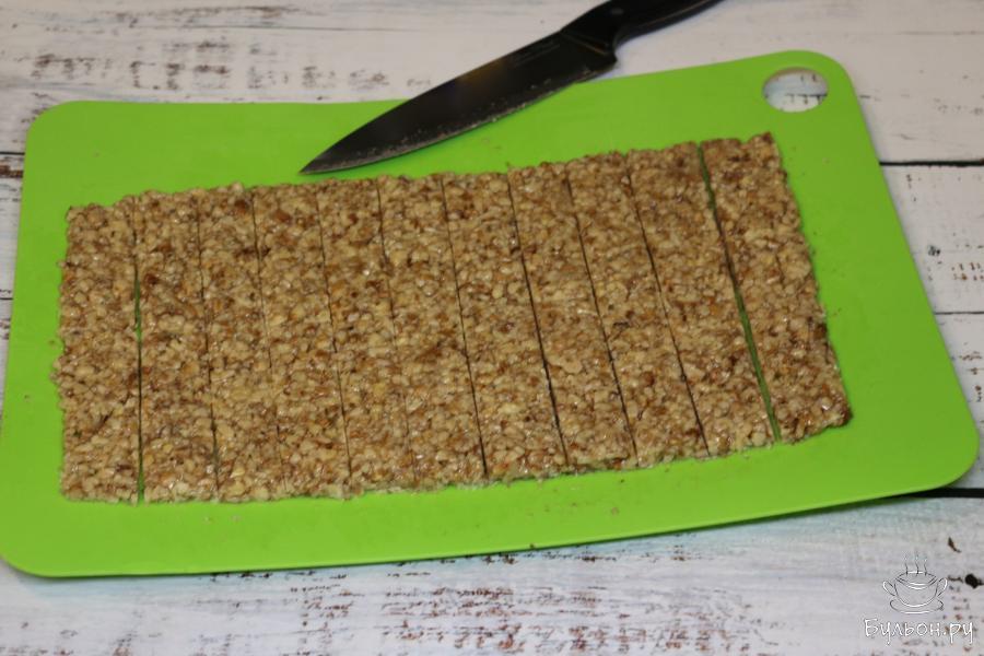 7. Острым ножом подровняйте края с четырех сторон и нарежьте гозинаки на порции: полоски, квадраты или ромбы.