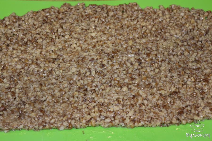 6. Доску и скалку окатите холодной водой. Медово-ореховую массу выложите на доску и тонко раскатайте.