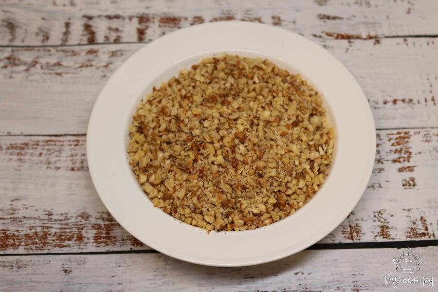 3. Через 15 минут достаньте орехи, выложите на доску, немного остудите. После, насколько это возможно, очистите орехи от шелухи, потерев их для этого между пальцами. Мелко порубите их.