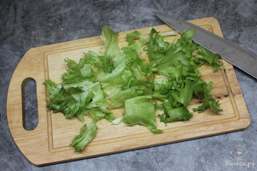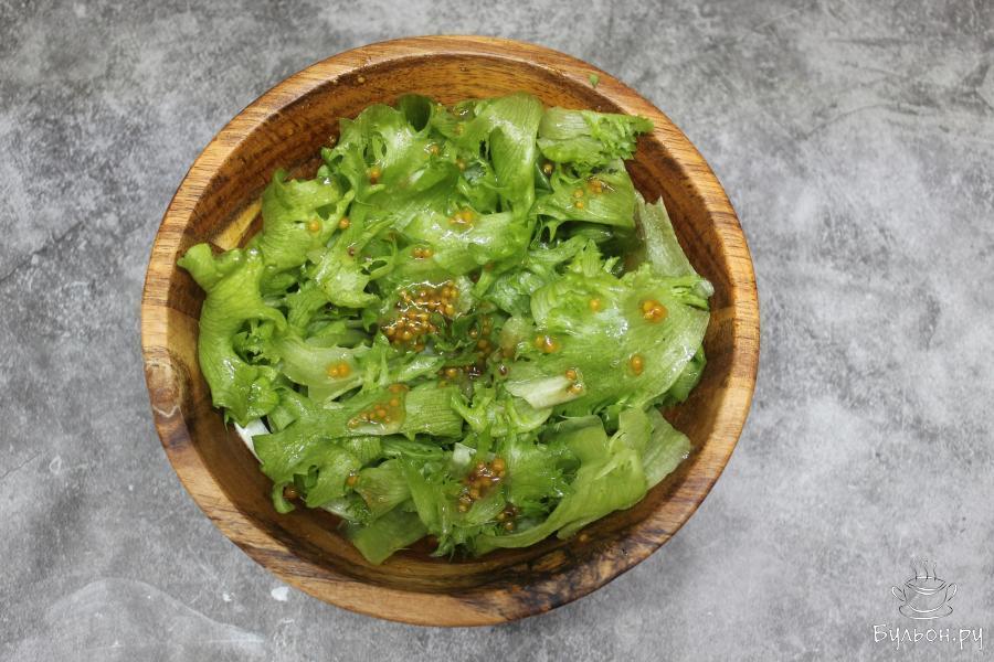 Очень люблю зеленые салаты, они ярко смотрятся на тарелке с основным блюдом и хорошо его дополняет по вкусу. Как правило, зеленые салаты готовлю из огурцов, но сегодня, для разнообразия, приготовила салат из листьев хрустящего фриллиса. Итак, на повестке дня у нас зеленый салат с горчично-медовой заправкой. По своему вкусу количество ингредиентов в заправке можно скорректировать, только с рисовым уксусом будьте осторожны, не переборщите.