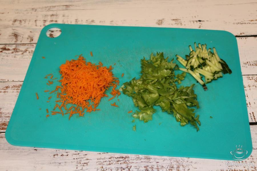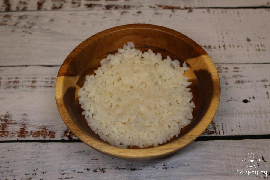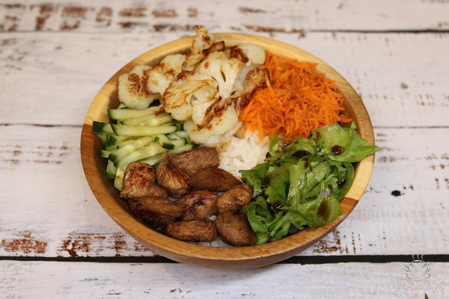 6. Затем выложите на рис все, ранее подготовленные, продукты. Смешайте 1 ст. л. соевого соуса, с медом и 1.3 ст. л. растительного масла. Этим соусом полейте сверху блюдо.